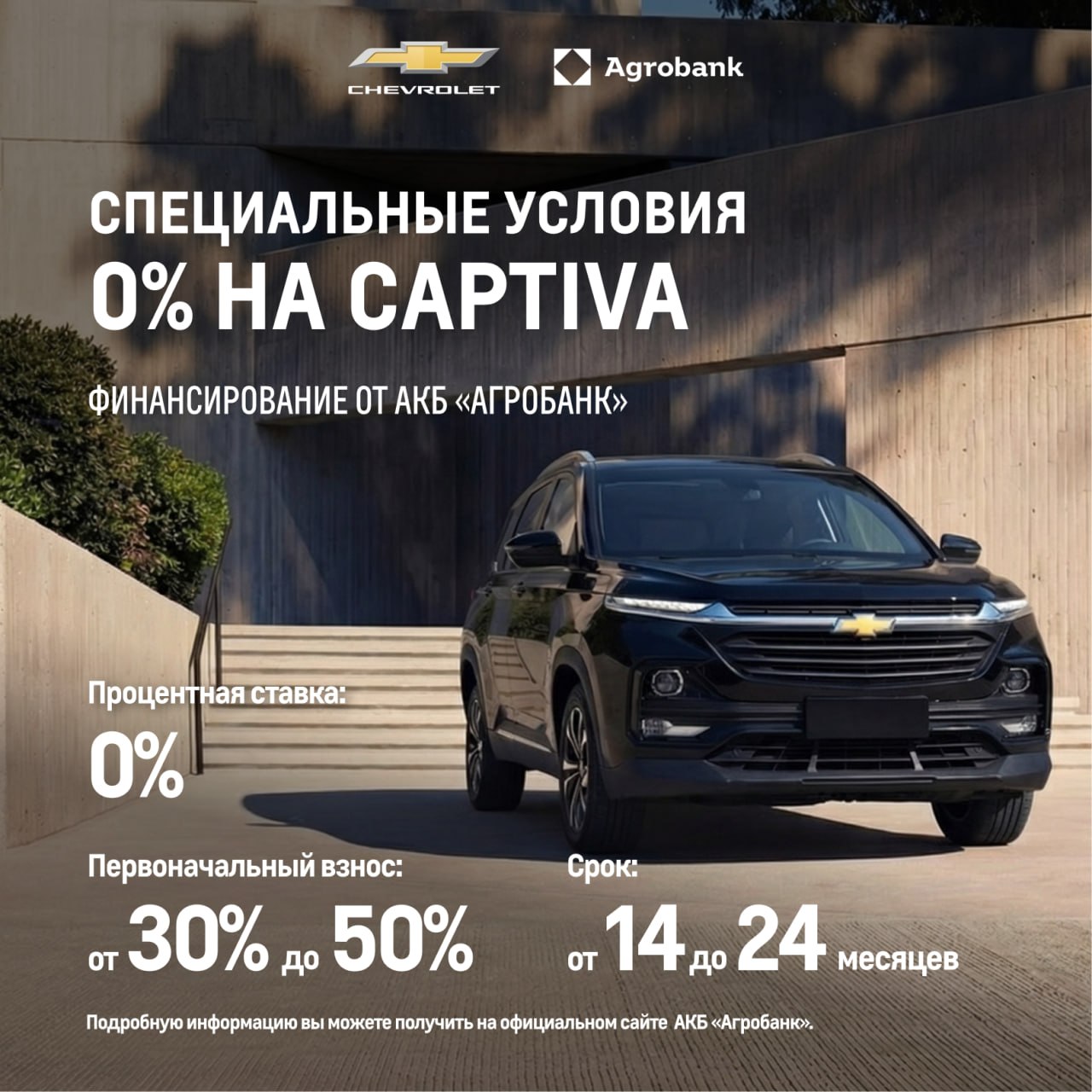 Условия финансирования осуществляются АКБ «Агробанк». Срок платежа определяется в зависимости от выбранной модели и размера первоначального взноса. Автомобили предлагаются по официальным ценам без скидок.