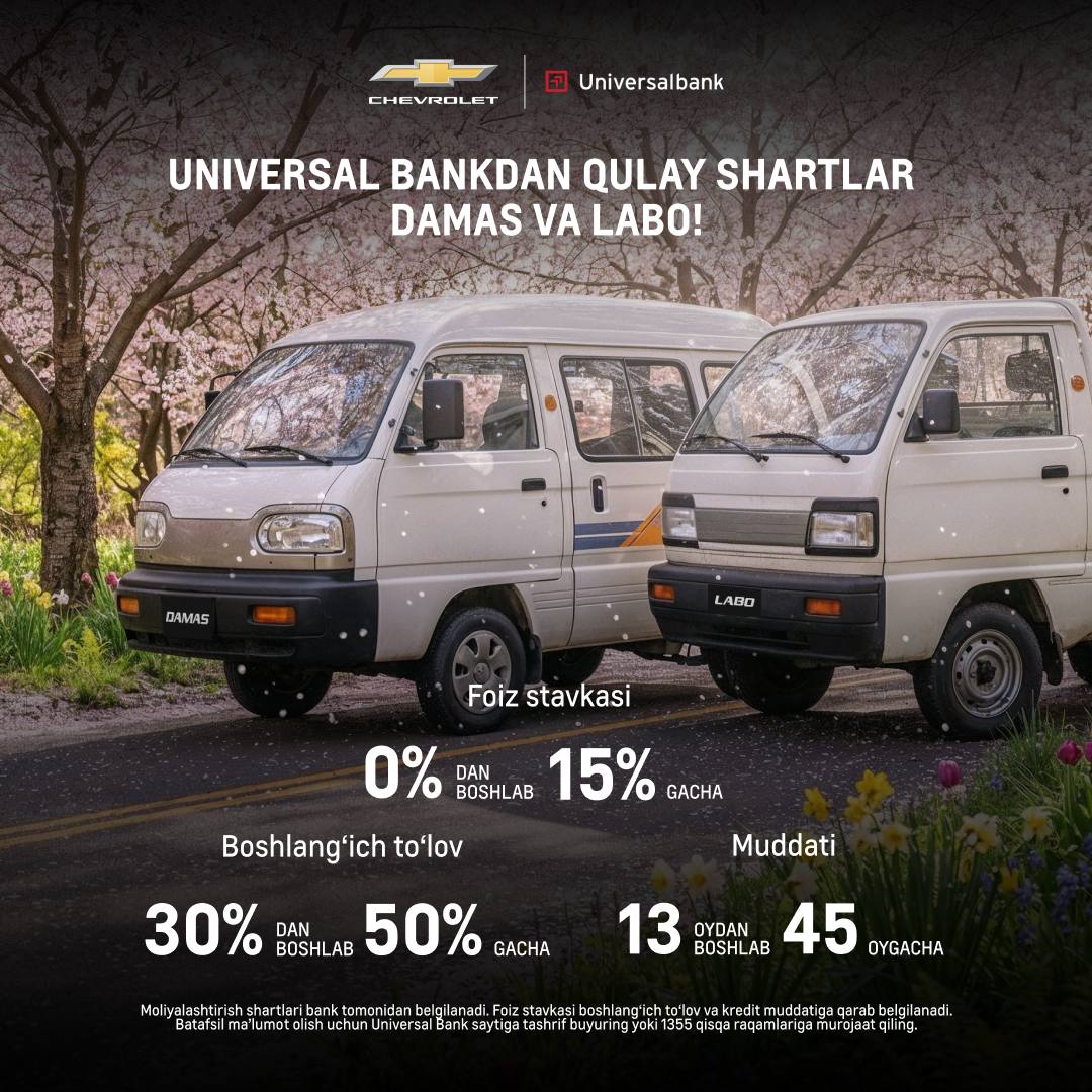 Maxsus hamkorlik dasturi doirasida Chevrolet Onix, Tracker, Damas, Labo va Captiva avtomobillarini manfaatli shartlarda xarid qiling.