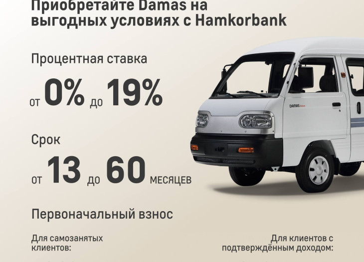 АО «UzAuto Motors» совместно с «Davr Bank» предлагают клиентам автомобили Labo и Damas по выгодным условиям с процентной ставкой от 0%.